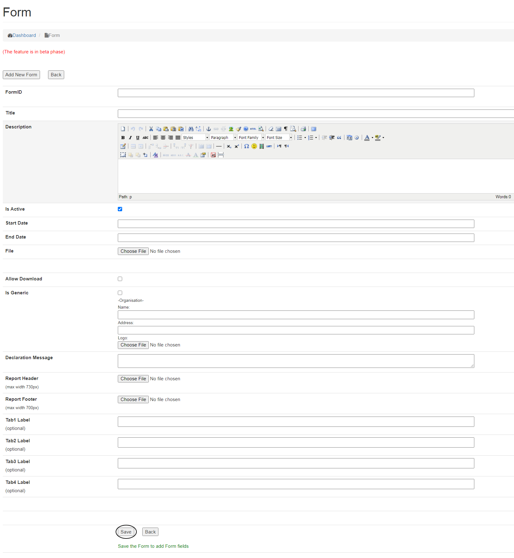 After having clicked on add form, you will see a screen with details that needs to be filled including: